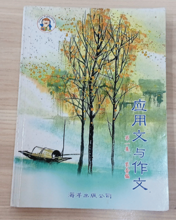 这本书的封面描绘了一艘小船停靠在水边,背景是几棵树和远山。书名是《应用文与作文》,出版公司是海洋出版公司